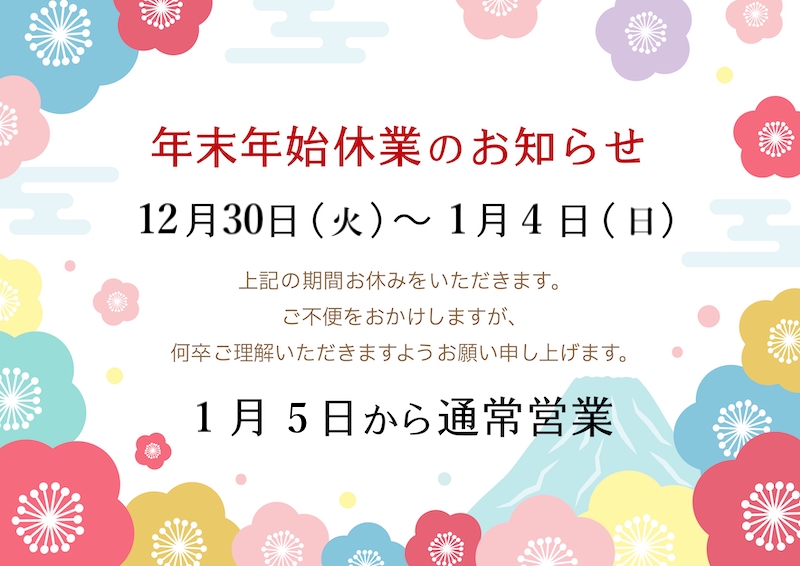 休業期間中にいただきましたご注文やお問い合わせ等に関しましては、2026年1月5日(月)以降より順次対応させていただきます。