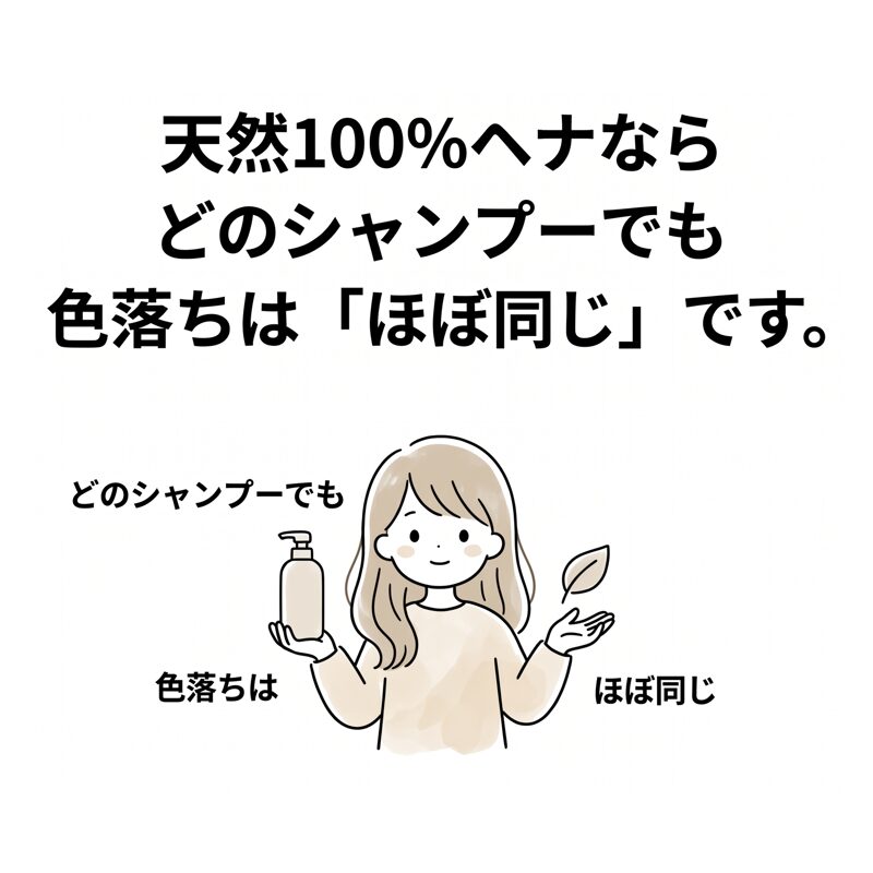 • 天然ヘナの色落ちは、シャンプーの種類よりも「染まりの質」に左右される。