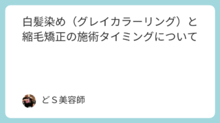 一般の方からの質問 白髪染め(グレイカラーリング)と縮毛矯正の施術タイミングについて んじゃ 今日の読者さんからの質問ね・・・・・・・・・・ぢ〜ぢさんこんばんは。一昨年白髪染めと縮毛のタイミングについて聞いた者です。2024.5.5の記事です。去年はぢ〜ぢさんが教えて頂いたように、縮毛の2週間後に白髪染めリタッチというタイミ... 2026.03.22 一般の方からの質問